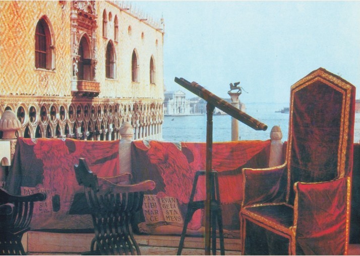 ▲为了纪念伽利略,圣马可大教堂阳台上,摆着几件伽利略发明的仪器。大教堂的圆柱上有一只张开双翼的狮子,是威尼斯城的城标。画面远处的背景是圣乔治修道院所在的小岛。
