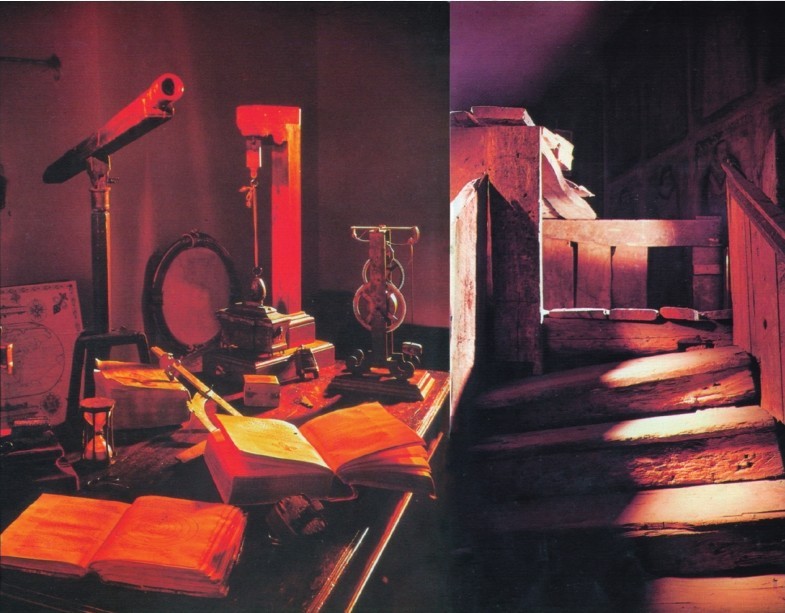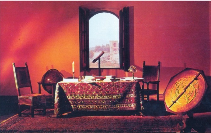 ▲上图的左半部分的桌上放着伽利略的用书和仪器,有望远镜,摆锤、计时沙漏等。右半部分是帕多瓦大学的木制讲台,可以想像,伽利略可能为了授课而登过此台。当时,既没有粉笔也没有黑板,教授不必多挪动身体。