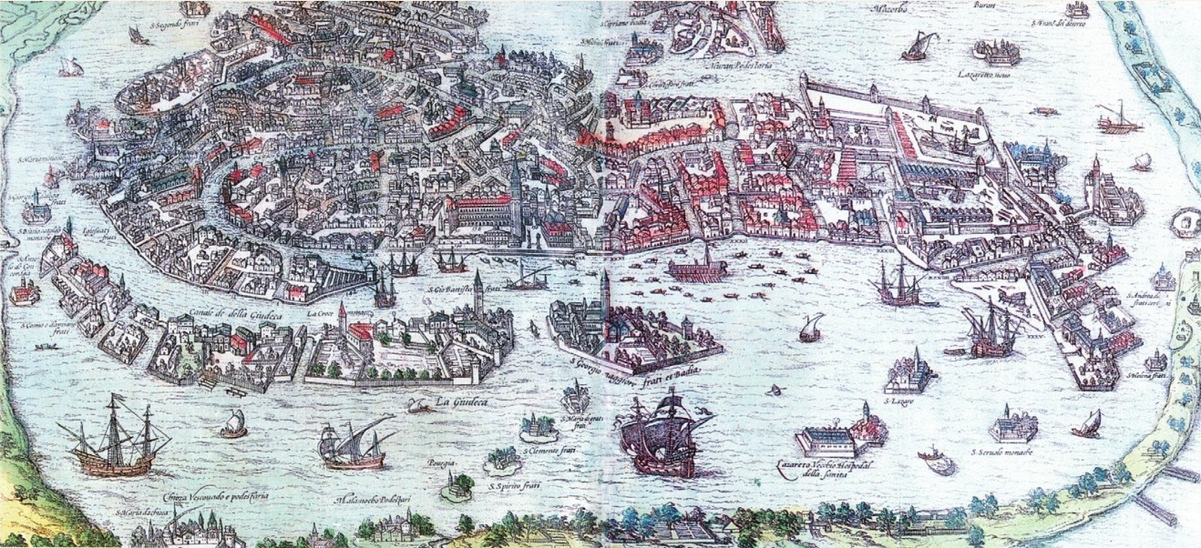 ▲伽利略时代绘制的威尼斯鸟瞰图。图上可以看到兵工厂(右半部中心)、圣马可广场和广场上的钟楼(图中心),穆拉诺岛位于图上方。