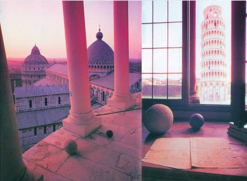 ▲现在的比萨斜塔顶上有几颗石球,图书室里还收藏了一封伽利略叙述重力定律的信。