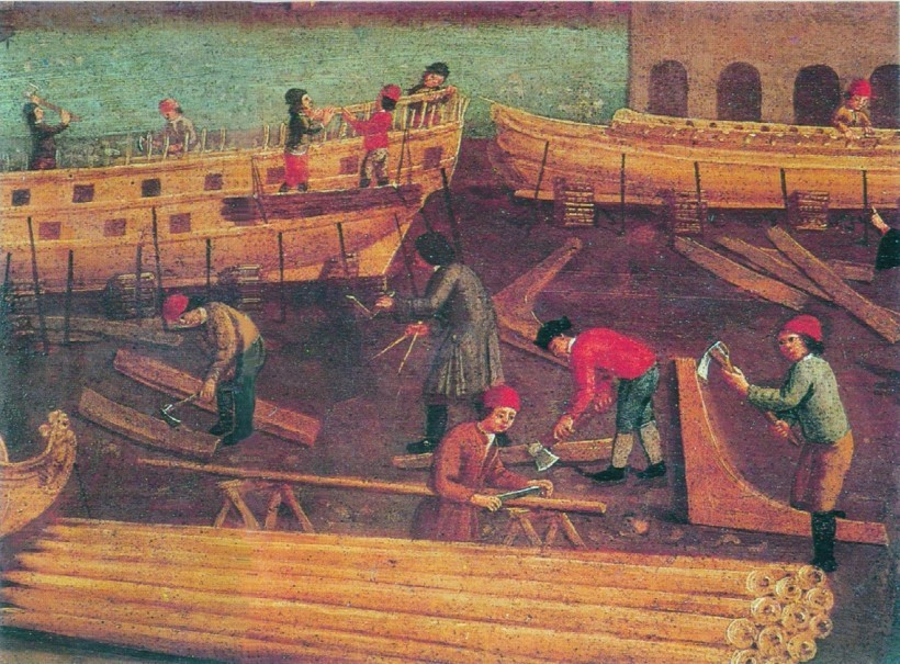 ▲17世纪,威尼斯的兵工厂正在建造一艘帆桨战船。