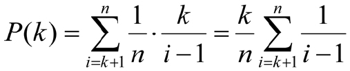 用 i 代表最佳候选人的位置,只有在 i 大于 k ,而且前 i -1个候选人中的最佳候选人位于前 k 个候选人之中时,公主才能选到最佳丈夫。那么对于某个固定的 k 来说,选到最佳候选人的概率就是: