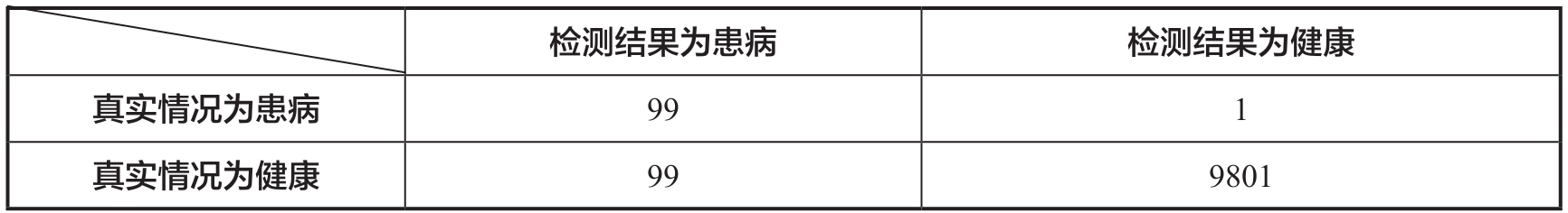 如表1.3所示,检测结果为患病的人总共有198人,其中有50%的人实际上是健康的,即小明实际上健康的概率是50%。与此类似,检测结果为健康的人总共有9802人,其中只有一人实际上患病,则对于检测结果为健康的人而言,检测错误的概率是0.01%。