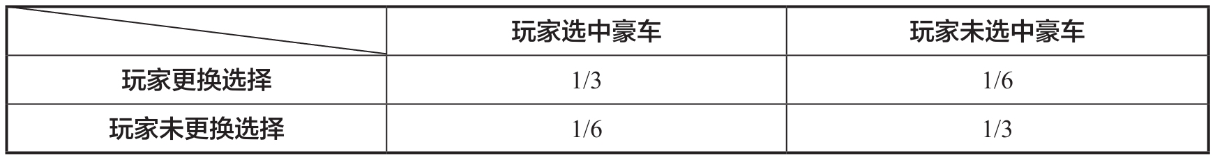 由表1.1即可汇总得出玩家是否更换选择与玩家是否选中豪车这两种情况的组合概率。结果如表1.2所示,玩家更换选择时选中豪车的概率是未选中豪车概率的两倍,即有2/3的概率选中豪车;未更换选择时选中豪车的概率是未选中豪车概率的一半,即有1/3的概率选中豪车。