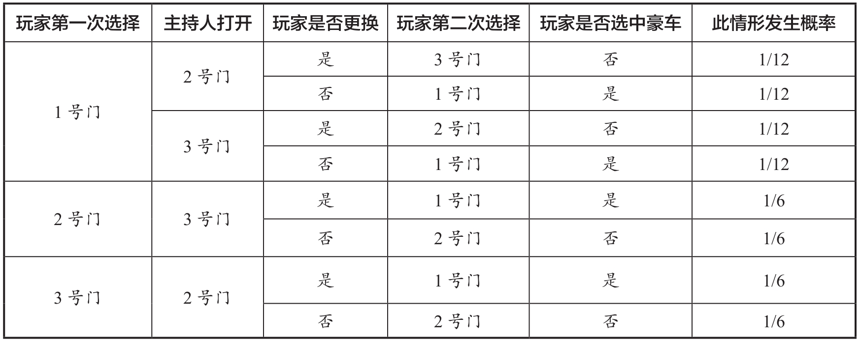 由于玩家选择1号门时,主持人既可打开2号门,又可打开3号门,并且打开这两扇门的概率相等,因此表1.1前4行的发生概率分别是1/12。而玩家选择2号门或3号门时,主持人只有一个选择,因此表1.1后4行的发生概率分别是1/6。