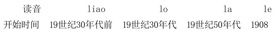 助词和语气词“了”本读liao,在19世纪30年代或更早出现lo的读音,常写作“咯”,这应是轻声引起的弱化读法。此后,又进一步弱化为la(常写作“喇”“啦”)、le[lə]。“了”的音变大致经历了四个阶段: