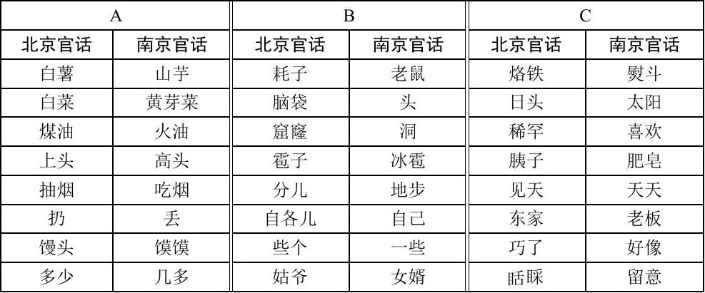 为什么有一些北京话词语没有传承到普通话中?究其原因,是晚清民国时期汉语共同语的词汇系统,经历了“南京官话——北京官话/南京官话——南北官话混合”三个阶段。根据艾约瑟《汉语官话语法》(1857)、威妥玛《语言自迩集》(1867)等文献记述,在1850年前后,通语由南京官话改为北京官话。当时的汉语教科书也由南京官话改为北京官话。不过,南京官话并没有消失,而是仍在南方通行。因此,南北官话并存成为晚清语言生活的重要特征。美国北长老会传教士狄考文编著的汉语教科书《官话类编》(1892)就是反映南北官话并存现象的重要文献。下面的例子是《官话类编》记录的北京官话和南京官话的词汇差异: