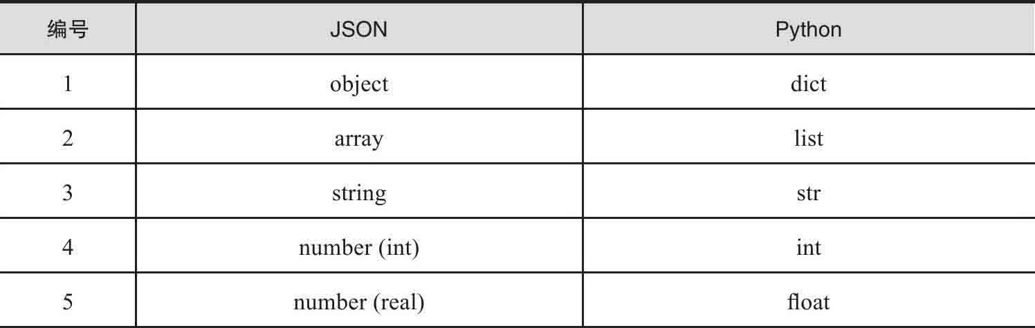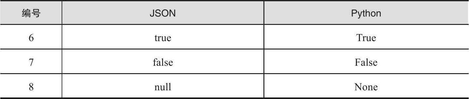 默认实现中,JSON和Python之间的数据转换对应关系如表1-10所示。