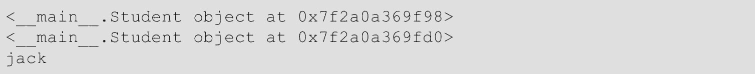(1)每次实例化都会得到一个新的对象,地址是不同的。变量stu1指向的就是一个Student的实例,后面的0x7f2a0a369f98是内存地址,每个object的地址都不一样,而Student本身则是一个类。