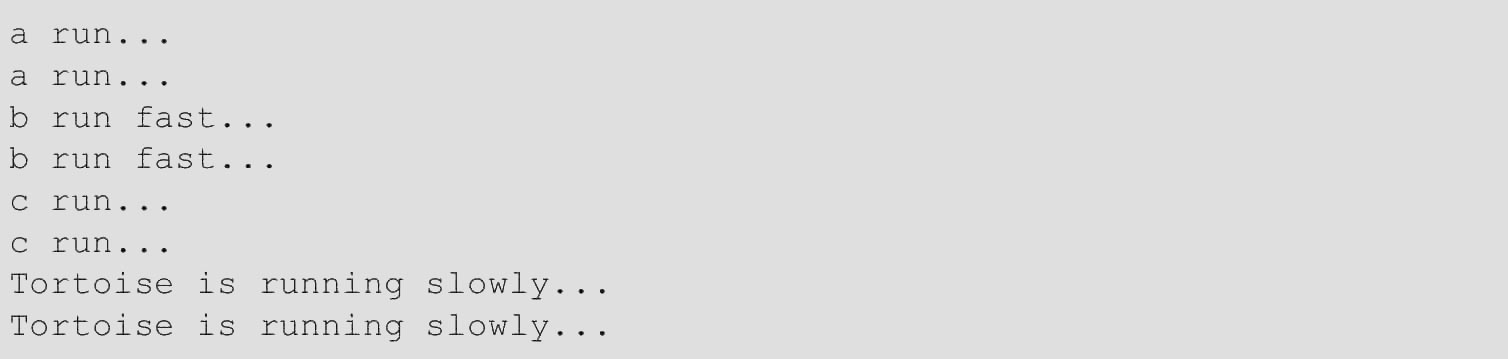(2)多态的好处就是,当需要传入Dog、Cat、Tortoise……时,只需要接收Animal类型就可以了,因为Dog、Cat、Tortoise……都是Animal类型,然后按照Animal类型进行操作即可。由于Animal类型有run()方法,因此,传入的任意类型,只要是Animal类或子类,就会自动调用实际类型的run()方法,这就是多态的意思。