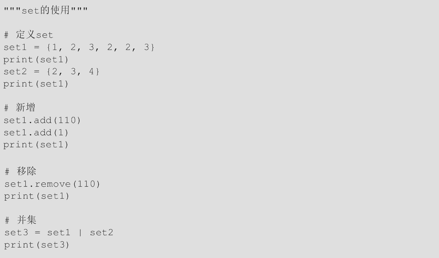 【范例1.3-14】set的使用(源码路径:ch01/1.3/1.3-14.py)