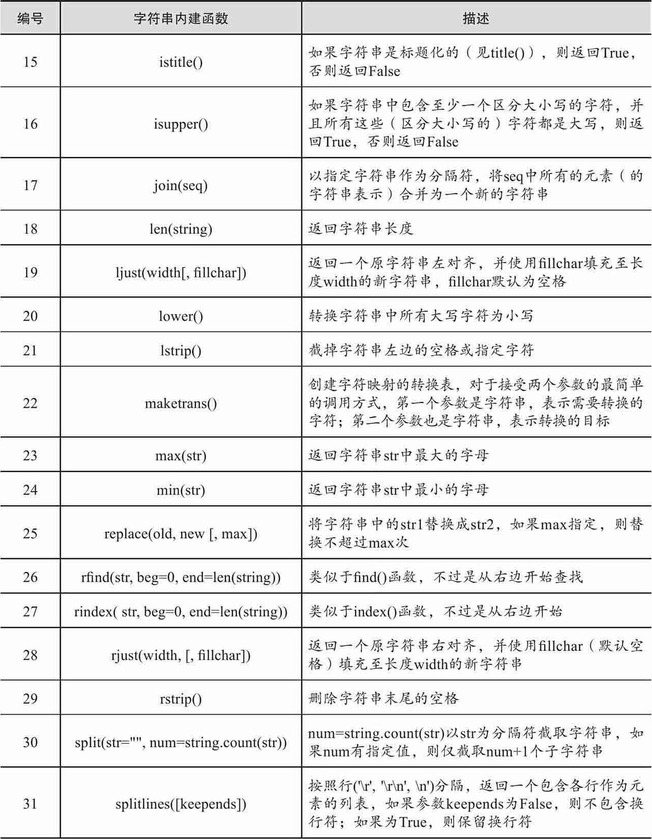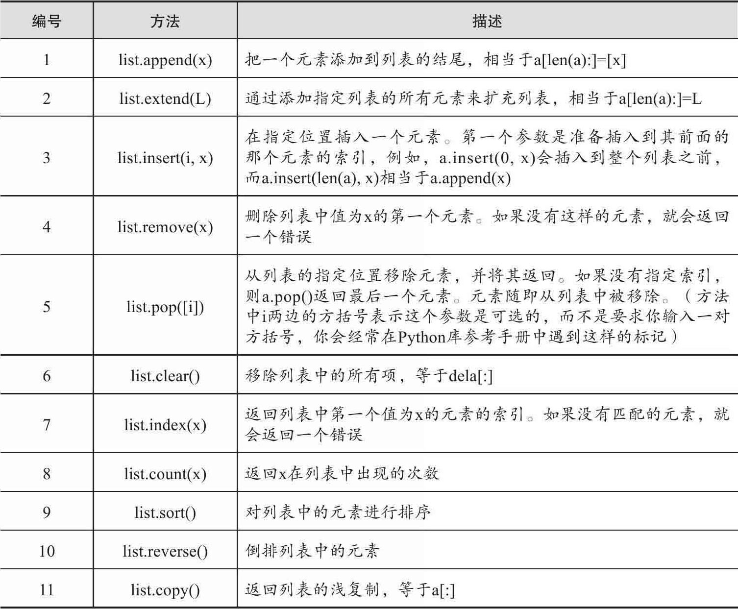 表1-1 list的方法