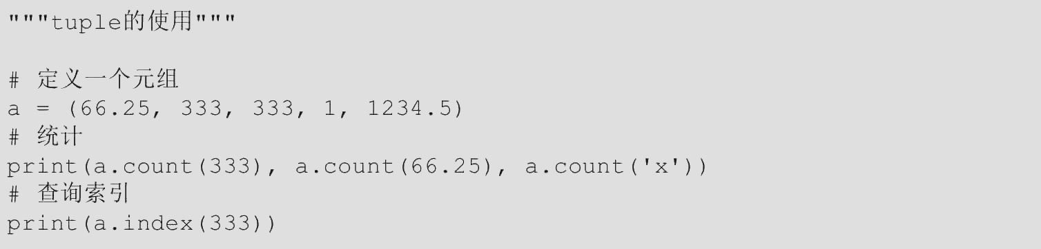 小括号内存储的值是元组的元素,元组相当于只读的列表,所以列表的查询方法元组都可以使用,如count、index等。