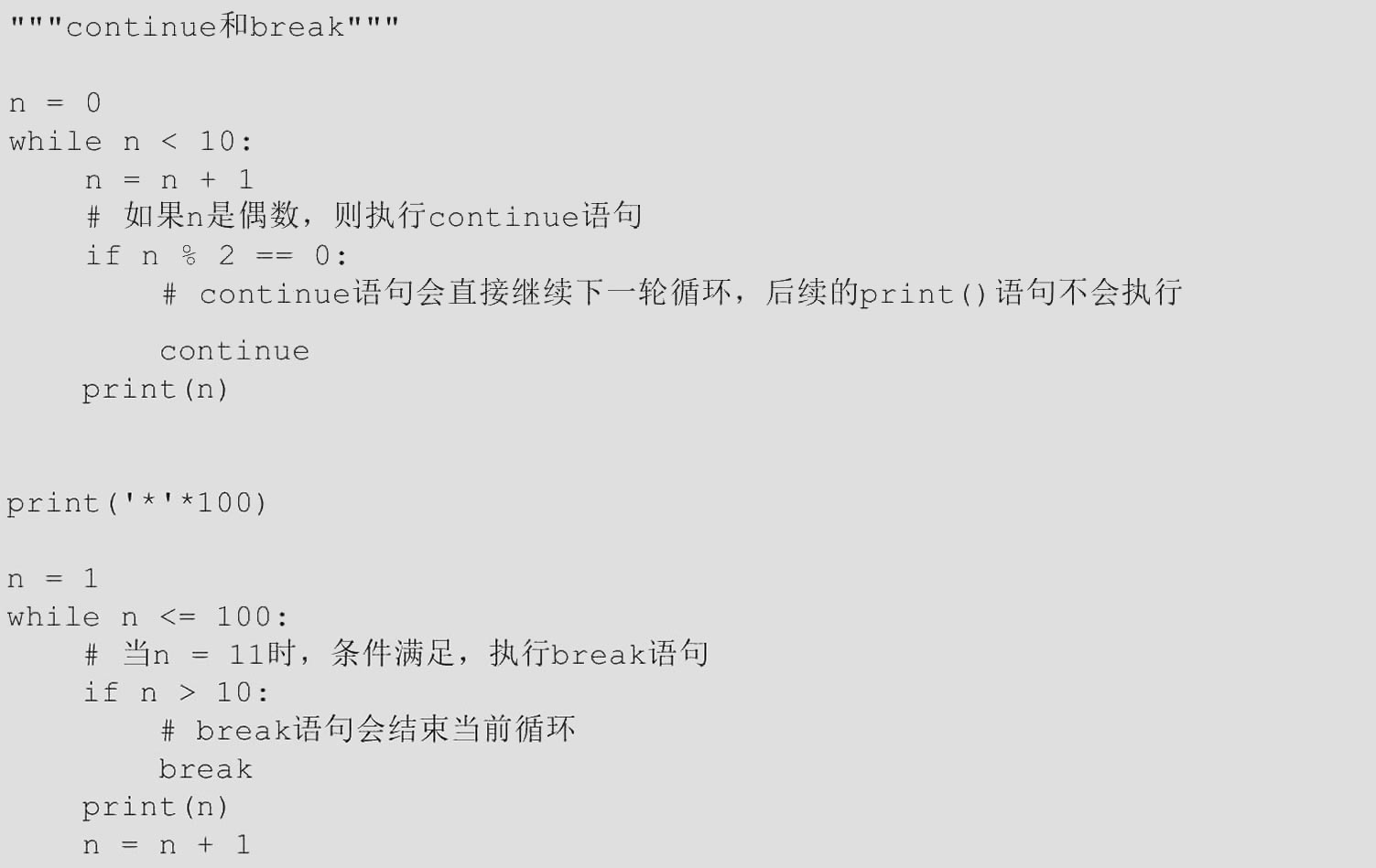 【范例1.3-10】continue和break(源码路径:ch01/1.3/1.3-10.py)