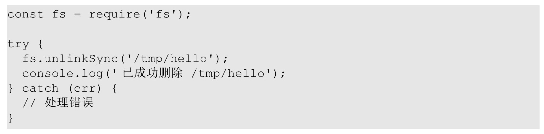 使用同步的操作发生的异常会立即抛出,可以使用try/catch处理,也可以允许冒泡。以下是一个同步操作文件系统的示例。