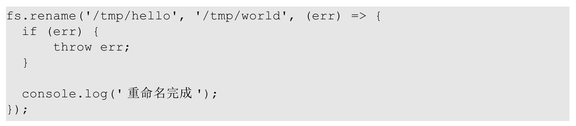 异步的形式总是将完成回调作为其最后一个参数。传给完成回调的参数取决于具体方法,但第一个参数始终预留用于异常。如果操作成功完成,则第一个参数将为null或undefined。以下是一个异常操作文件系统的示例。