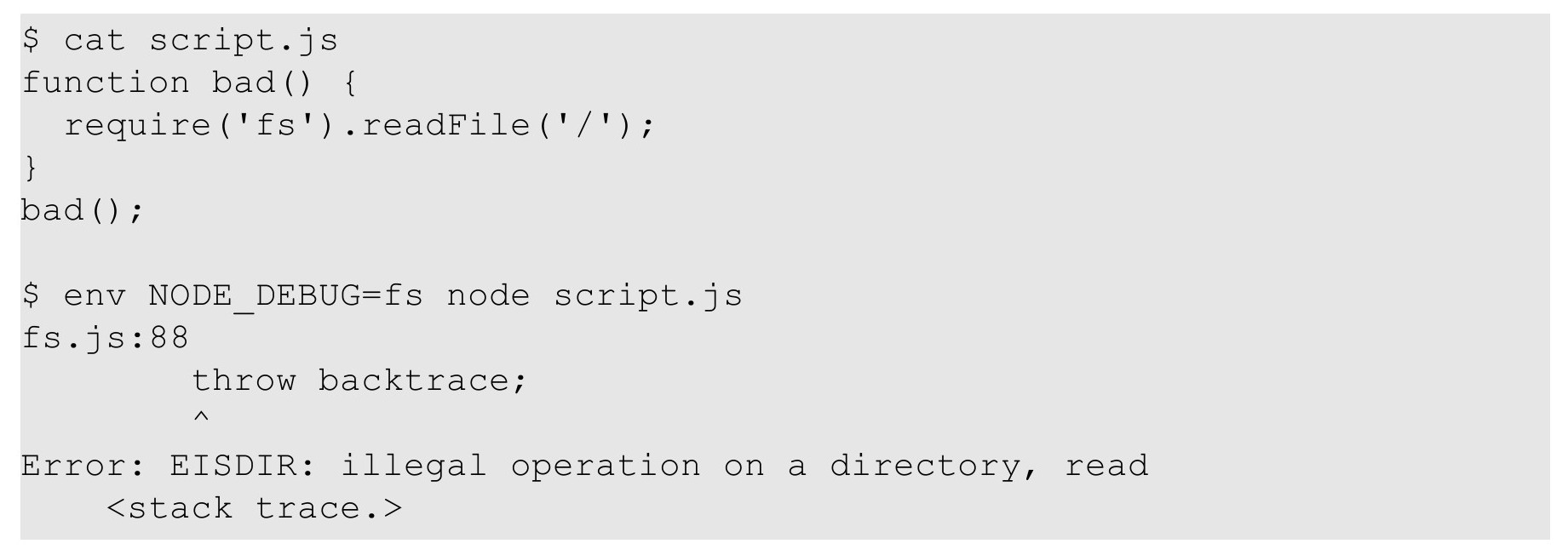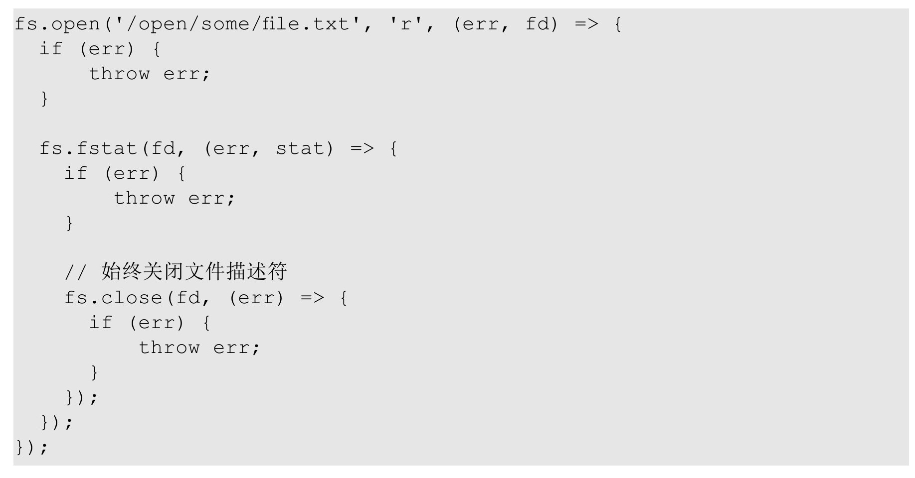 虽然不推荐这样使用,但大多数fs函数允许省略回调参数,在这种情况下,使用一个会重新抛出错误的默认回调。要获取原始调用点的跟踪,则设置NODE_DEBUG环境变量。