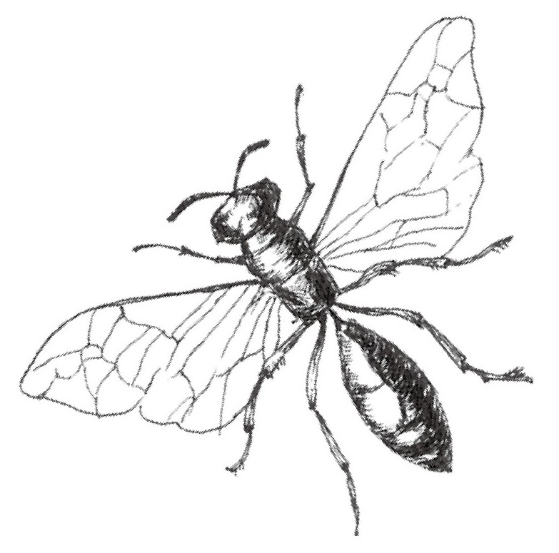 一只正在捕猎的瘦弱的黑色小膜翅目昆虫匆匆地飞向这个敞开的筐子。这是黑色短柄泥蜂,我经常在蔷薇茎里发现它们的巢房,蜂巢里的储藏物有时是叶蝉,有时是黑色的蚜虫。有8只黑色短柄泥蜂越过笃耨树里流出的浆液,钻进瘿中,它们并不在意自己可能会被粘住。
