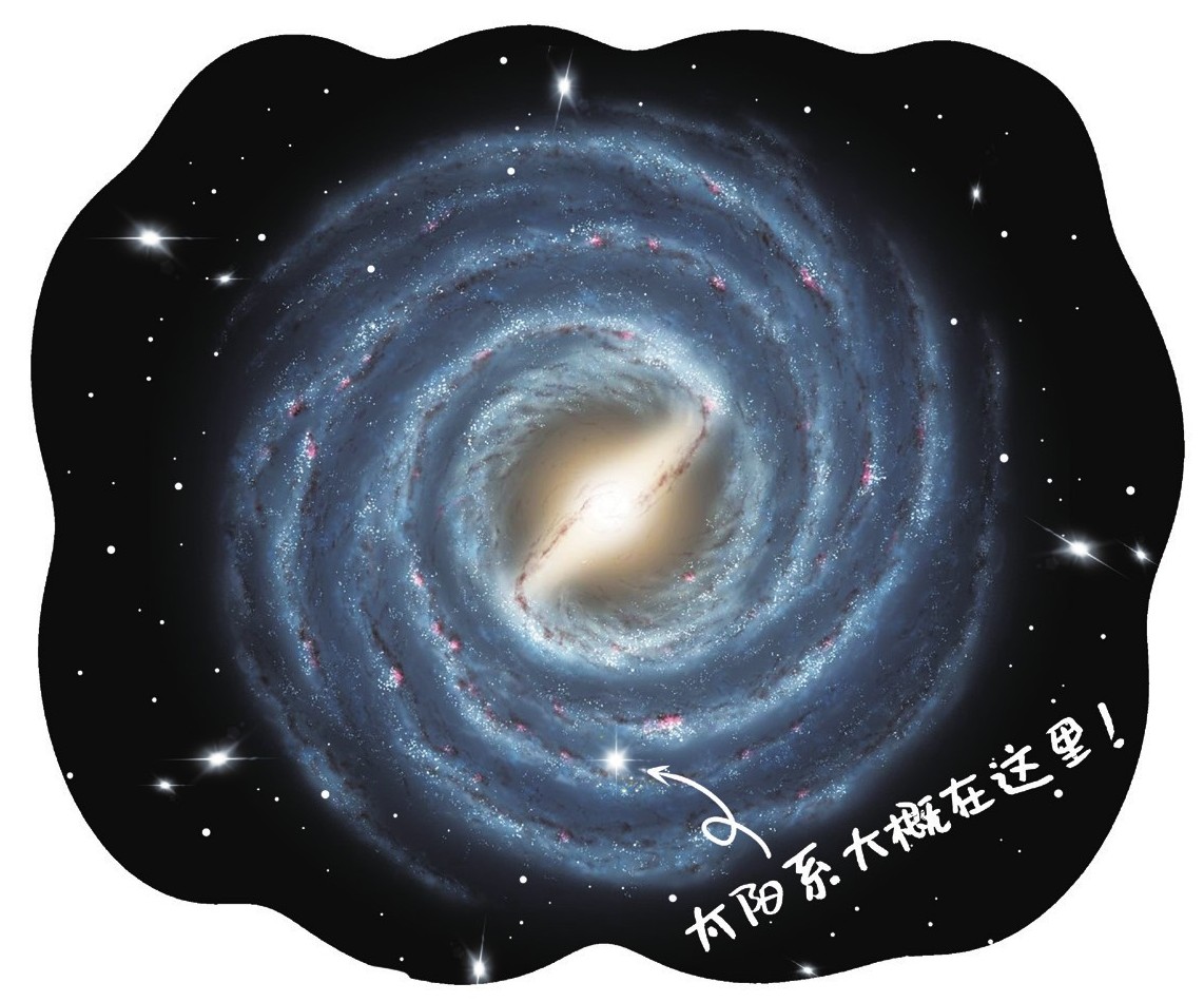 过去人们一直认为,银河系是一个漩涡状星系,但最新的研究表明,银河系应该是一个棒旋星系——在银河系的中心处有一个长度约为2.7万光年、由恒星和尘埃组成的棒状结构。银河系中的大多数恒星集中在一个扁球状的区域内,就像一块巨大的铁饼。“铁饼”中间突出的部分叫“核球”,半径约为7000光年。核球的中心部分是“银核”,四周叫作“银盘”,在银盘外围还有一个更大、更疏松的球状区域,叫作“银晕”。
