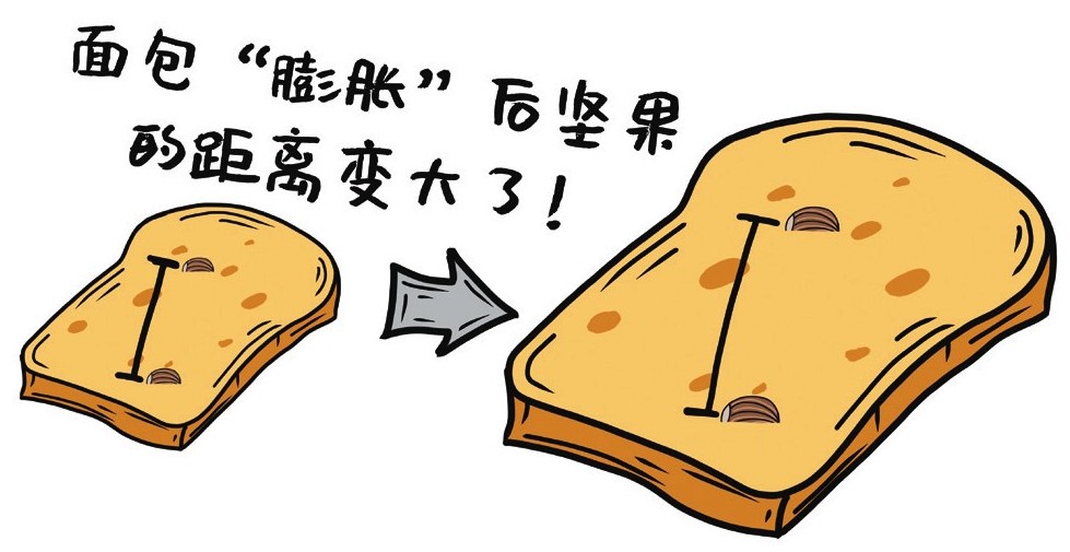 宇宙大爆炸不同于烟花的绽放,不是从一个中心点向四周散开,而是发生在宇宙的每一处。我们可以把宇宙想象成一块巨大的面包,星系就是这块面包上的坚果,面包在烘烤过程中均匀地膨胀,原本紧挨在一起的坚果也离得越来越远。