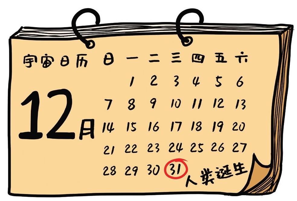 大约138亿岁的宇宙对我们来说实在是太“老”了,所以为了更好地理解宇宙大爆炸以来发生的重要事件,不妨把这漫长的时间压缩,绘制一张“宇宙日历”。在这张“日历”中,假设大爆炸发生在1月1日的零点,我们现在所处的时间大概为12月31日夜里12点。