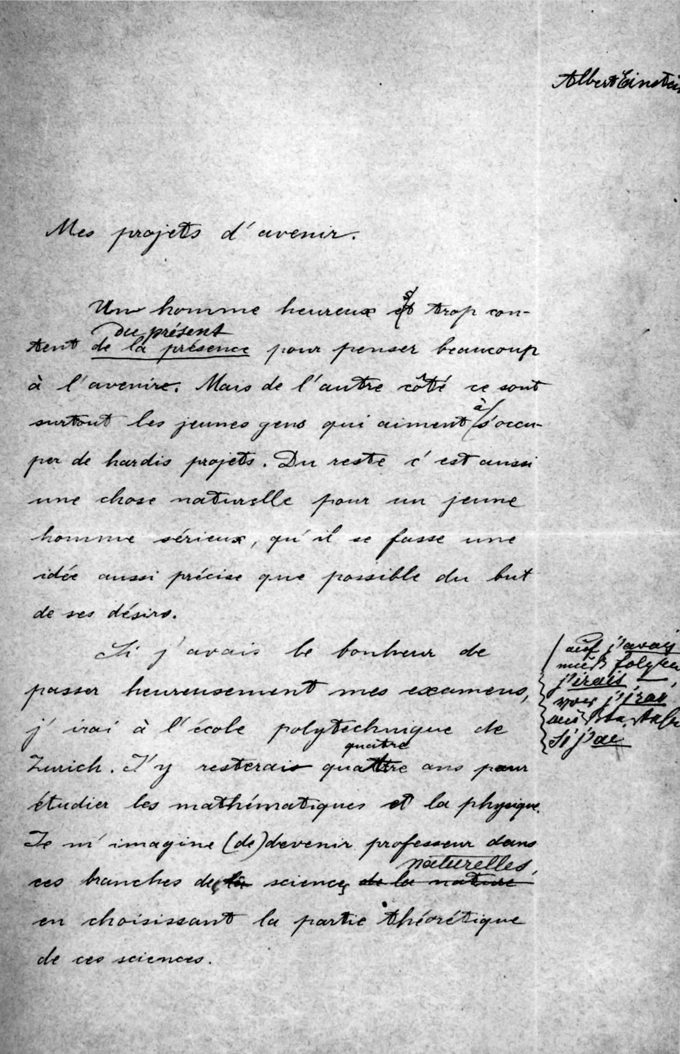 ◀1896年9月,爱因斯坦在他毕业考试的法语作文中精确地描述了对未来的计划。