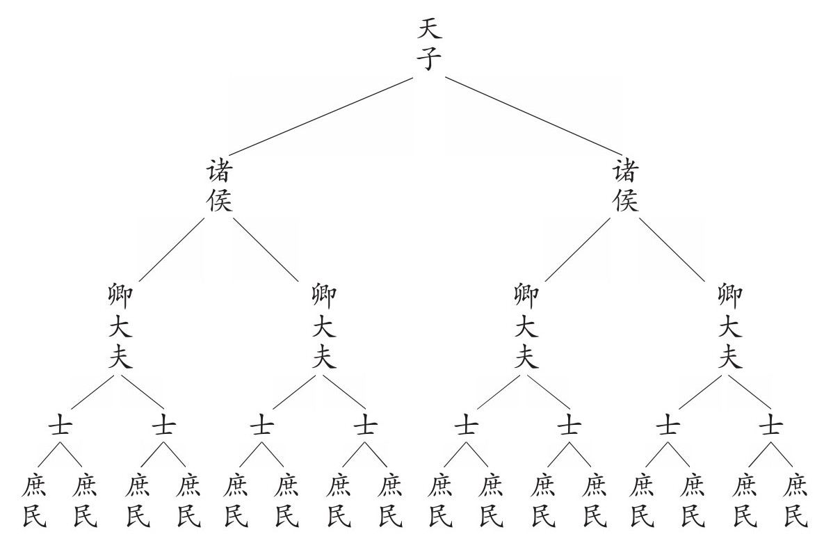 分封制 西周的地方行政制度是“分土封侯”制,或谓之“封诸侯,建藩卫”,简称“分封制”。所封诸侯都在王畿以外,各建邦国。受封者有三种原因:一为周王的同姓(姬姓)亲属,二为功臣,三为古帝王之后。《荀子·儒效篇》曰:“周初立七十一国,姬姓独居五十三人。”诸侯对天子有隶属关系,有镇守疆土、捍卫王室、交纳贡税、朝觐述职的义务。诸侯在封国内是君主,初封时就是半独立状态,在封国内亦实行分封制。国内土地的一部分归诸侯直辖,一部分作为采邑分封给他的卿大夫,卿大夫又以同样方式分土地给士,士直接统治、剥削庶民。封国内的层层分封制也是与宗法制度相结合的,实行嫡长子世袭制。这样的层层分封,形成为一座政治宝塔,压在广大劳动人民头上。自天子至士,为各级贵族,庶民主要是农业劳动者。这座政治宝塔示意如下: