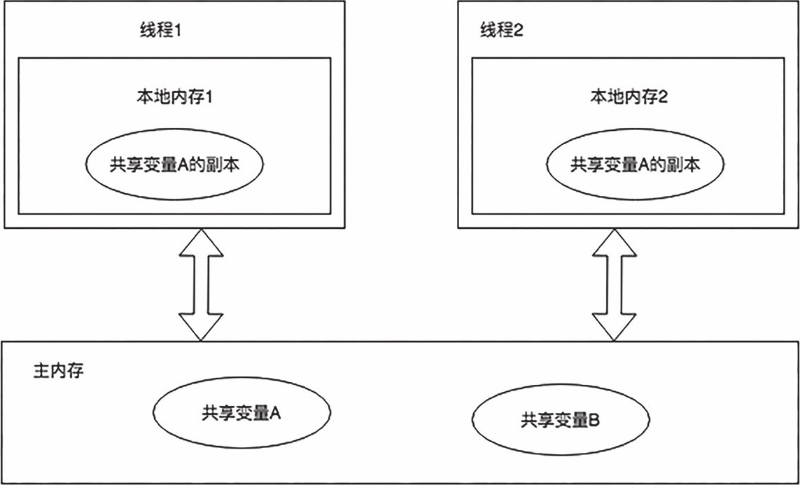 首先,被多个线程共享的数据存放在主内存,如图2.8所示的共享变量A和共享变量B。不过为了提高性能,Java线程一般会将共享数据拷贝一份到自身的本地内存,如图2.8的共享变量A在线程1和线程2都有一份数据副本,其中本地内存一般是指线程的寄存器。