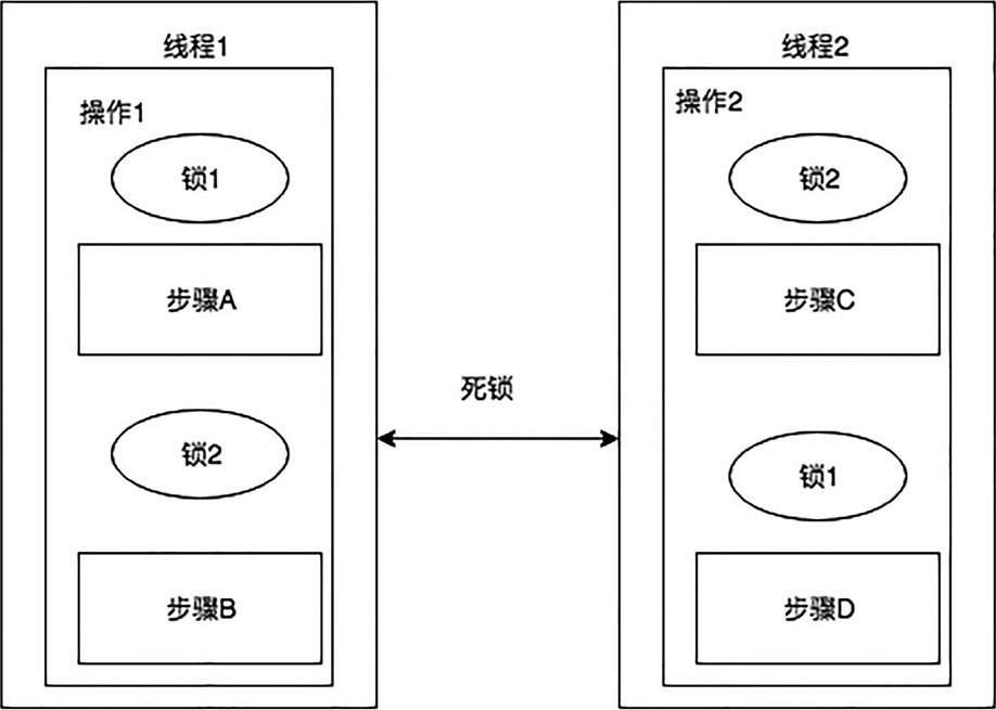 操作1由步骤A和步骤B组成,其中完成步骤A需要获得锁1,完成步骤B需要获得锁2,而操作2由步骤C和步骤D组成,其中完成步骤C需要获得锁2,完整步骤D需要获得锁1,即刚好跟操作1相反。