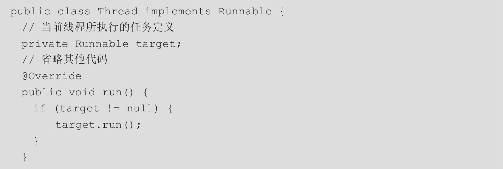 可能有读者会好奇Thread内部是如何调用这个Runnable接口实现类的run方法的。其实在源码实现层面,Thread类自身也是实现了Runnable接口并在内部定义了一个Runnable对象属性,然后可以通过Thread类的构造函数传递一个Runnable对象实例来对其进行赋值。