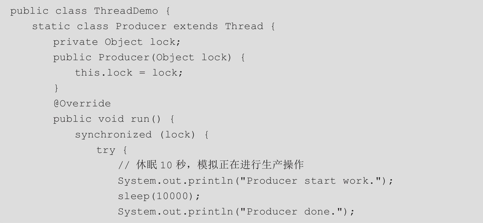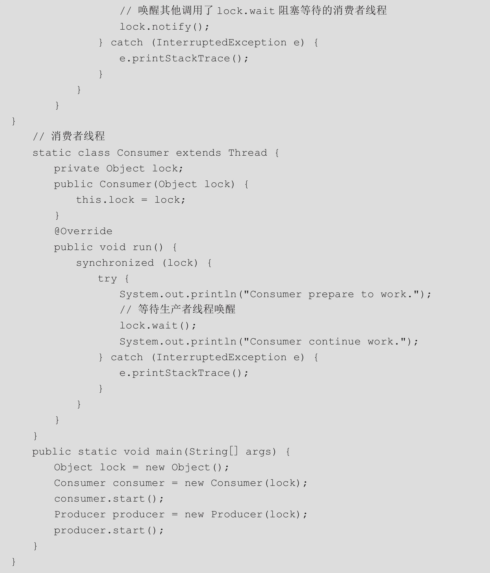 例如,消费者线程需要等待生产者线程执行完才能开始执行,二者通过调用一个Object类型的对象实例lock的wait和notify来进行协作。即消费者线程调用wait等待生产者线程执行完,生产者线程执行完时,调用notify来通知消费者线程可以继续往下执行了。具体的实现如下: