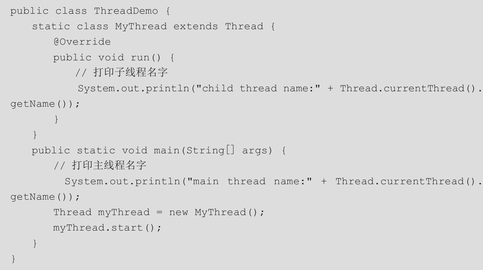 Java多线程最简单的使用方法就是创建一个Thread类的继承类,实现其run方法来定义业务逻辑。然后再创建该继承类的对象实例并调用其start方法来开始执行,具体例子如下,该例子的作用是分别打印主线程和子线程的名字。