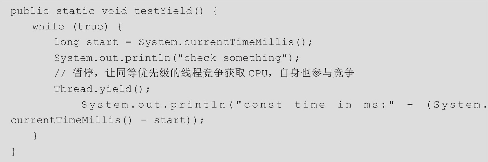 yield方法由于不能指定暂停的时间,只是给同等优先级的线程提供竞争CPU的机会,并且自身也会继续参与竞争,所以不存在中断终止的情况,不需要捕获中断异常。示例如下: