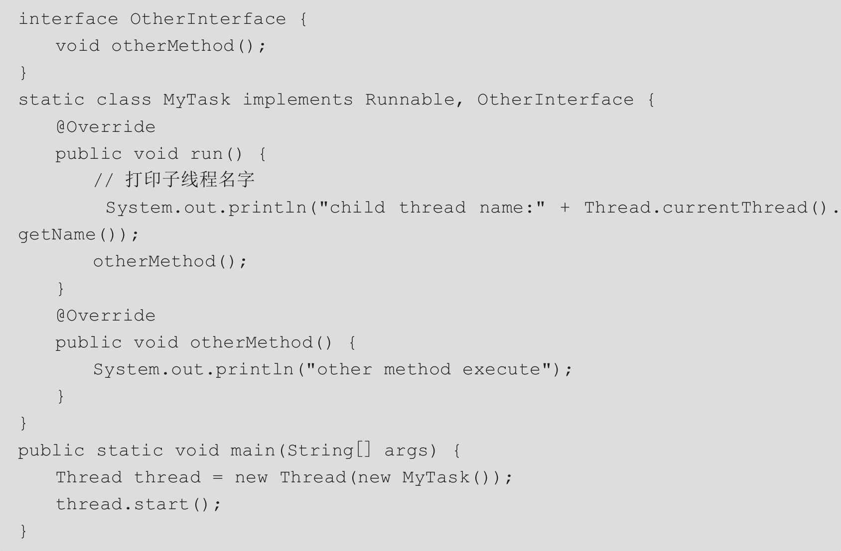 关于Runnable接口用法的具体例子如下。定义Runnable接口的实现类,该实现类同时实现了两个接口,分别为Runnable接口和自定义的OtherInterface接口。然后在主线程中创建该实现类的一个对象实例,并且将该对象实例作为Thread类的构造函数参数来创建Thread类对象实现,最后直接调用Thread类的start方法启动线程,所以整个过程直接创建Thread类的对象实例即可,具体业务逻辑在Runnable接口的实现类定义如下: