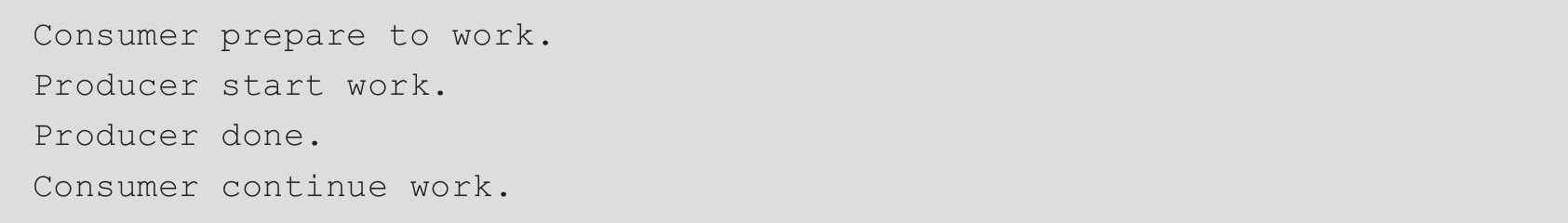 主要逻辑为:消费者Consumer先开始一些准备工作,刚开始由于生产者Producer还没有开始工作,故Consumer等待wait,之后Producer开始工作,10秒后工作完成并通知Consumer可以继续工作了。
