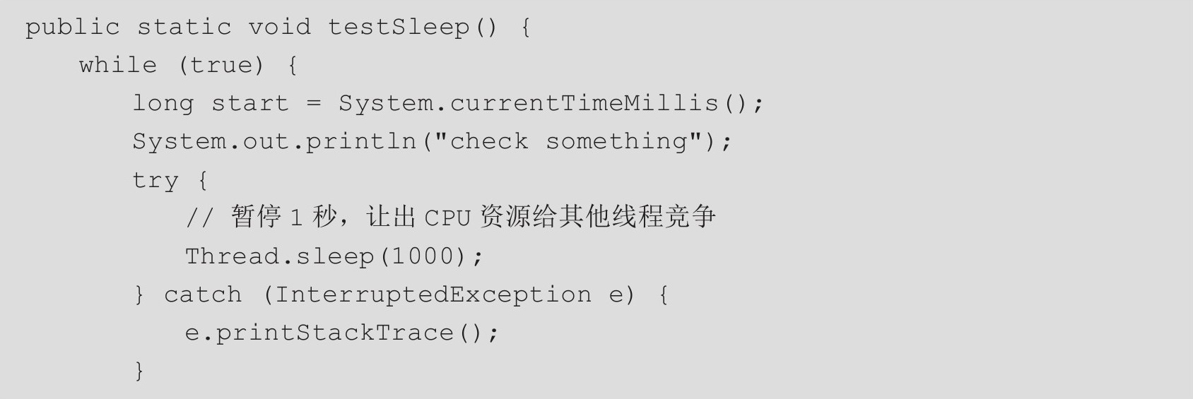 在线程执行过程中,如果run方法内部是在一个无限循环中检查某种状态,如消费某个队列的数据或者进行重试某个操作直到成功,为了避免该线程一直占用CPU资源,可以调用sleep方法来暂停指定时间,让出CPU资源给其他线程使用。线程在调用sleep休眠之后是可以被其他线程中断的,故需要通过try/catch来捕获中断异常InterruptedException,其中sleep是Thread类的一个静态方法。
