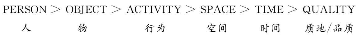 Heine,Claudi,and Hünnemeyer(1991)认为语法化项(新)语义功能的获得发生在宏观结构(macrostructure)和微观结构(microstructure)两个层面上。其中宏观结构以隐喻过程为特征,而微观结构以转喻过程为特征。作者认为,宏观结构的隐喻过程是语法化的“中心策略”,其普遍性的映射(mapping)链是由具体到抽象,即:
