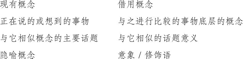 为了给约翰逊“两个观点,一个意义”的说法成为可操作的科学理论,里查兹首先指出隐喻的两个观点或两个方面没有统一的术语,不同学者大致使用以下几种提法:
