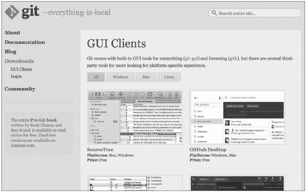 在Git官方网站(https://git-scm.com/downloads/guis)上有多款GUI工具,有的是商业软件,有的是免费软件,如图2-9所示。
