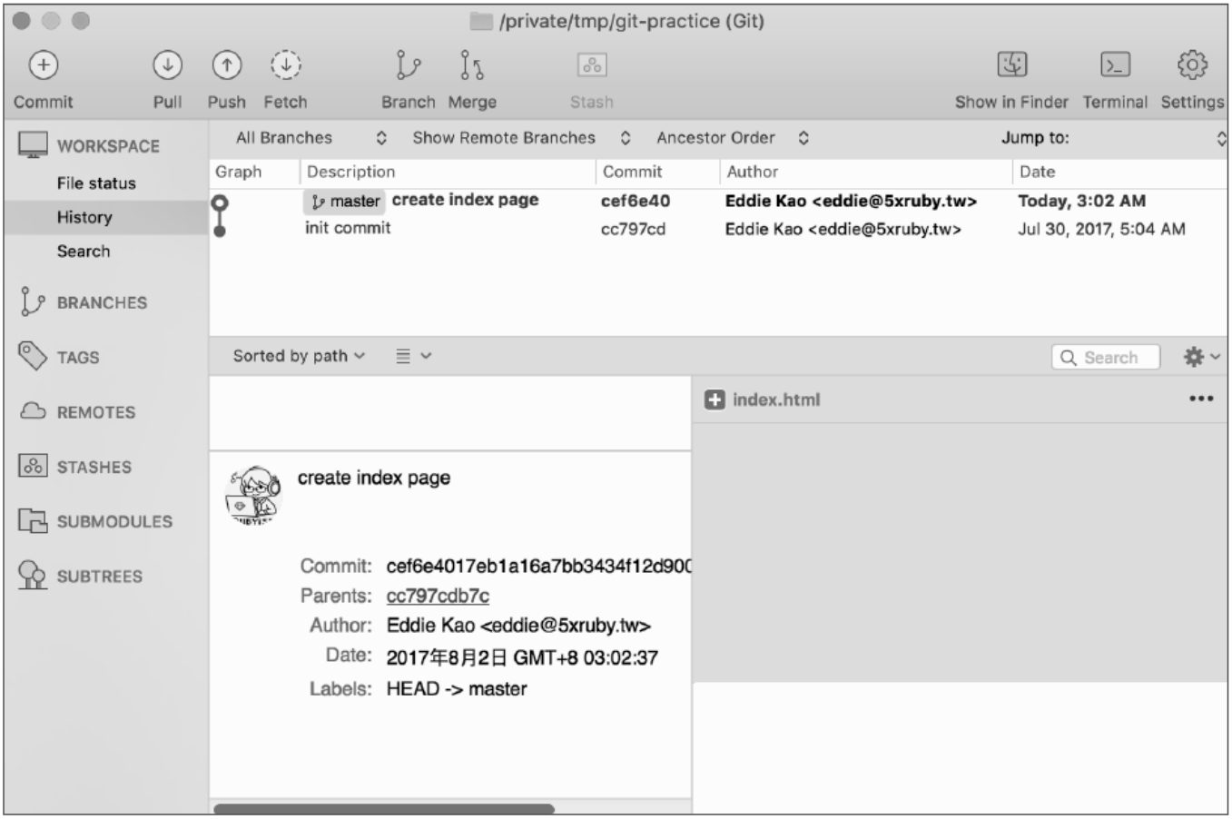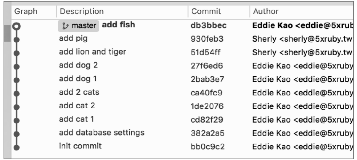 两相比较,使用图形界面工具比在终端机窗口使用Git命令清楚多了。因此,在查看记录时,建议初学者使用图形界面工具,不仅可以少输入一些字,而且可以显示更完整的信息。