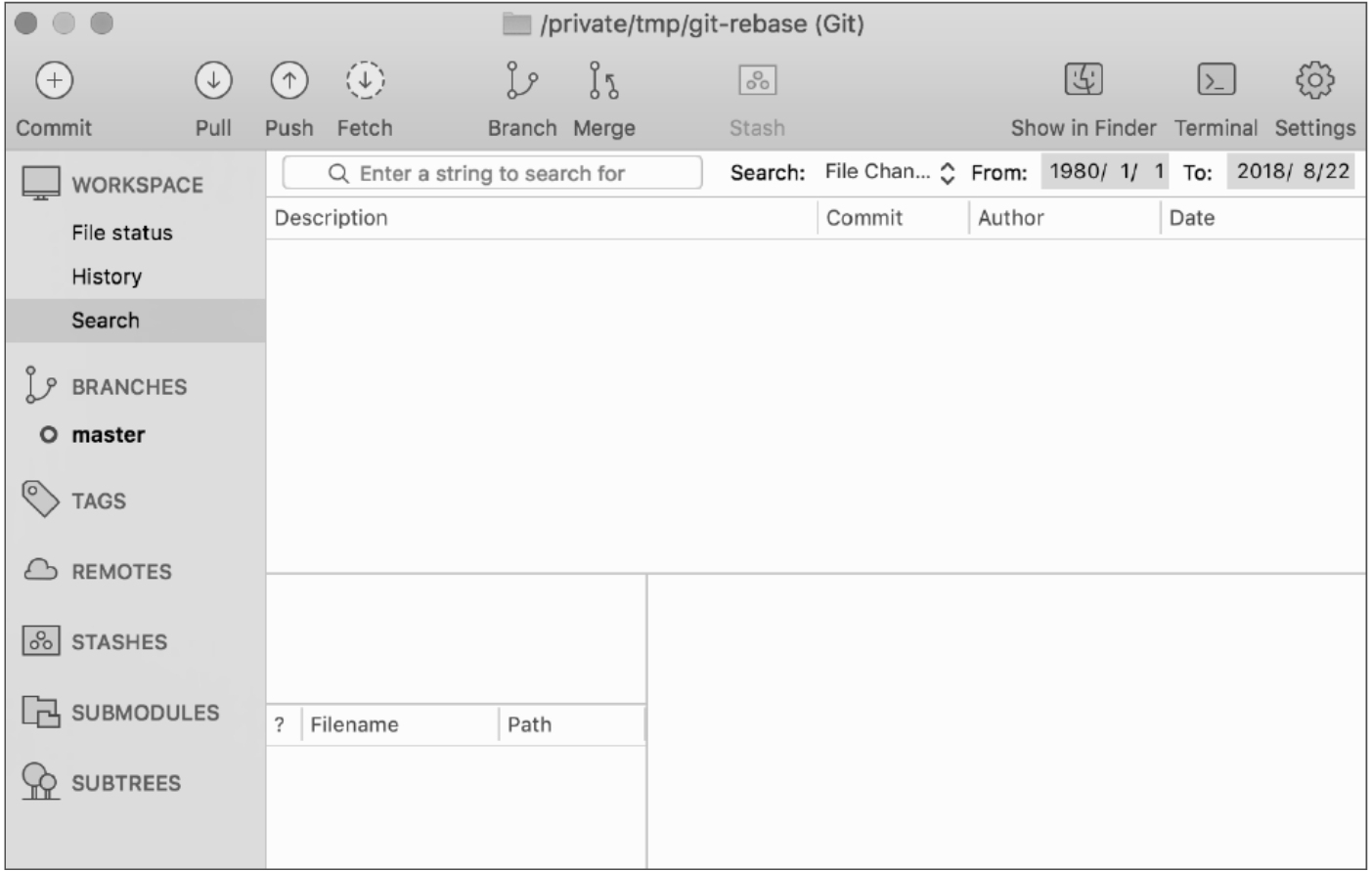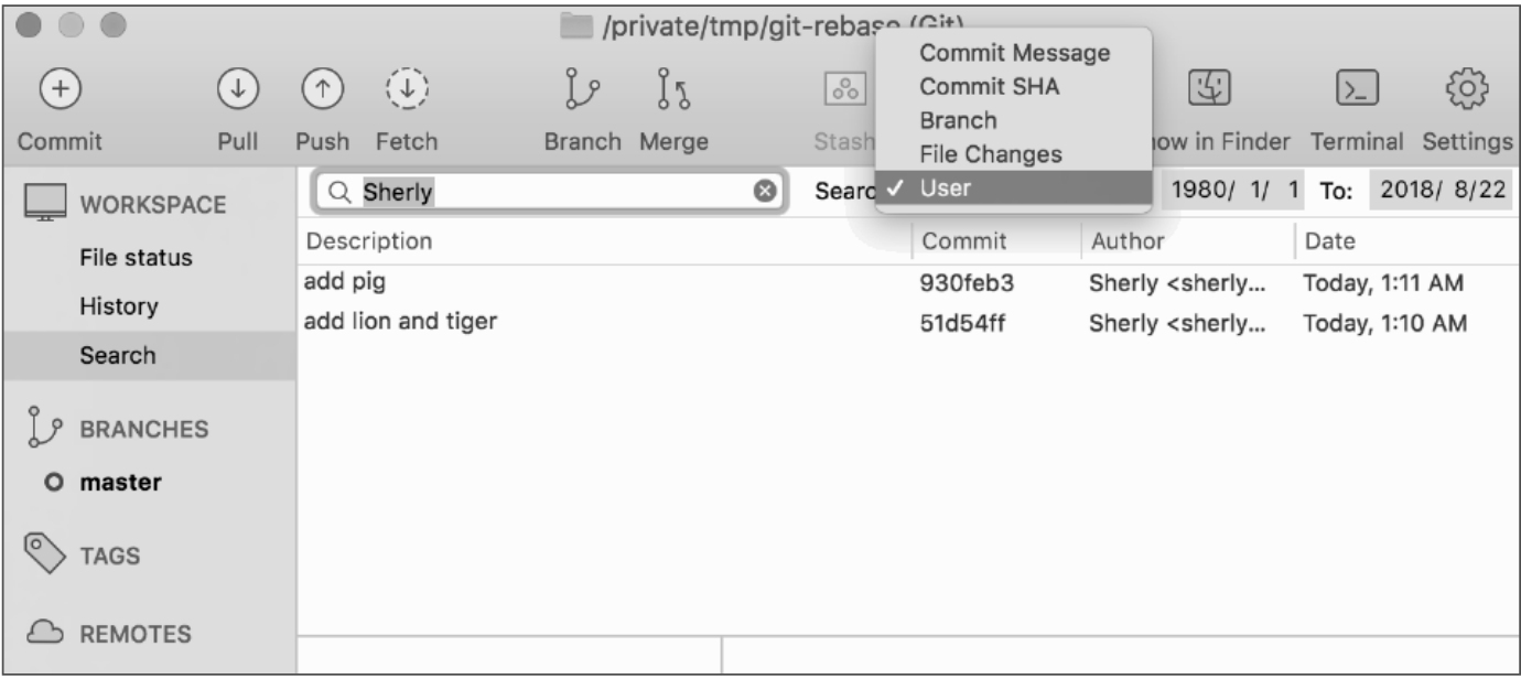 以上这些命令做到的事,在SourceTree中都可以很方便地完成。在左侧菜单栏中选择WORKSPACE→Search选项,即可进入搜索界面,如图5-14所示。