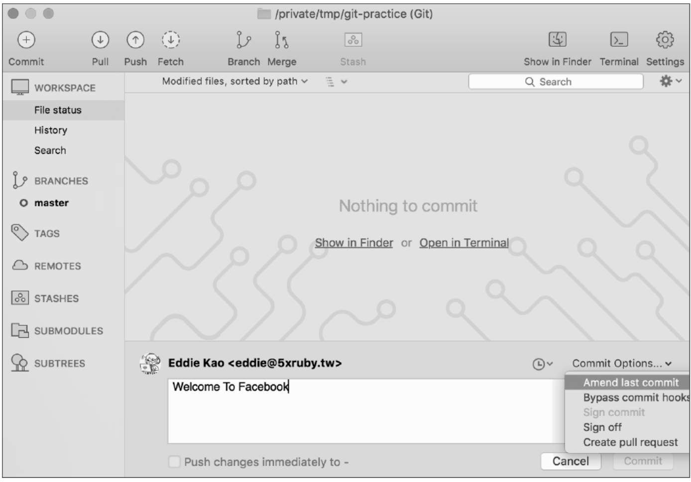 $ git commit --amend -m "Welcome To Facebook" [master 614a90c] Welcome To Facebook Date: Wed Aug 16 05:42:56 2017 +0800 1 file changed, 0 insertions(+), 0 deletions(-) create mode 100644 config/database.yml