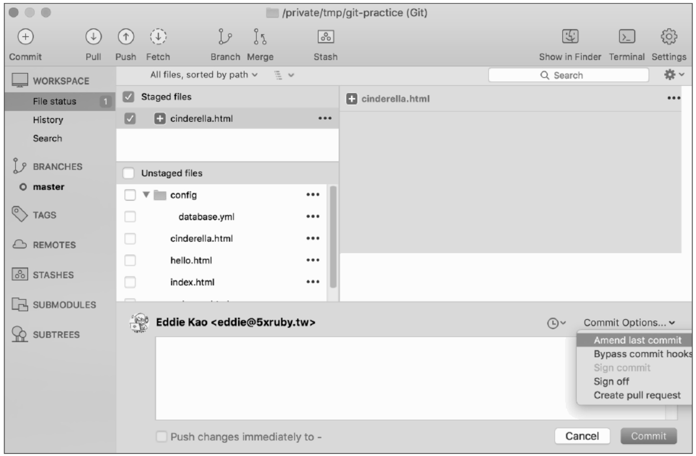 如果使用SourceTree,同样也是先把cinderella.html文件加至暂存区(勾选),然后在Commit的时候选择Commit Options→Amend last commit选项,如图5-24所示。