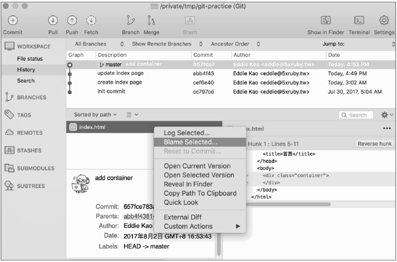如果使用SourceTree,可以在想查看的文件上右击,选择Blame Selected选项,如图5-27所示。