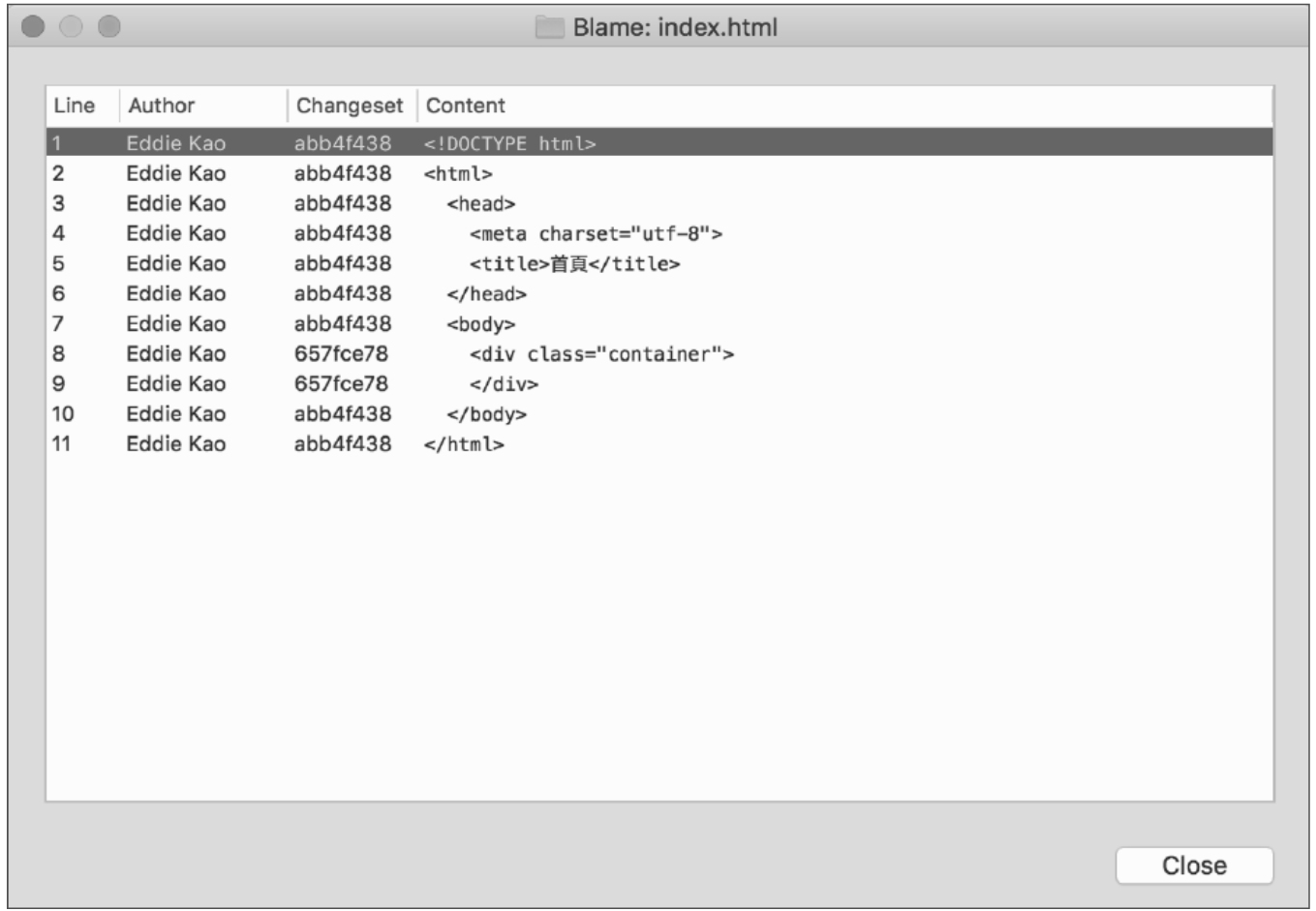 这样就可以很清楚地看出来哪一行代码是谁在什么时候写的,而最前面看起来像乱码的文本,正是每次Commit的识别代码,表示这一行代码是在哪一次的Commit中加进来的。以这个例子来说,除了第8行和第9行的代码(657fce78),其他的代码都是在同一个Commit中加进来的(abb4f438)。