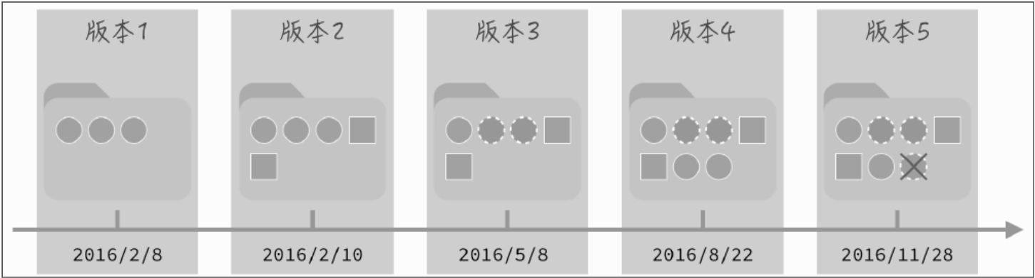 如图1-1所示,随着时间的变化,一开始resume目录中只有3个文件,过两天增加到5个;不久之后,其中的2个被修改了;过了3个月后又增加到7个;最后又删掉了1个,变成6个。每次resume目录的状态变化,不管是新建或删除文件,抑或是改动文件内容,都称为一个“版本”,如图1-1中的版本1 ~ 5。而所谓的“版本控制系统”,就是用来记录所有的这些状态变化的,使你可以像搭乘时光机一样,随时切换到过去某一“版本”的状态。