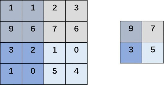 通常在设计卷积网络结构时,卷积层后会跟着一个池化层。池化(Pooling)的操作类似于卷积,只是将滤波器与感受野之间的元素相乘改成了对感受野直接进行最大采样。简单来说,池化层是用来缩减模型大小,提高模型计算速度及提高所提取特征的鲁棒性。池化操作通常有两种,一种是常用的最大池化(Max Pooling),另一种是不常用的平均池化(Average Pooling)。池化操作过程也非常简单,假设池化层的输入为一个4*4的图像,这里用最大池化对其进行池化,执行最大池化的池化核是一个2*2的矩阵,执行过程就是将输入矩阵拆分为不同区域,对于2*2的输出而言,输出的每个元素都是其对应区域的最大元素值。最大池化如图4.7所示。