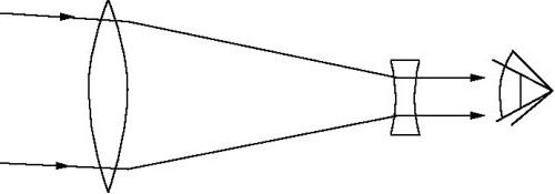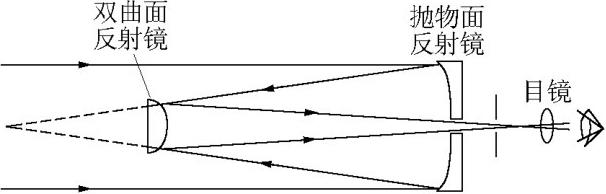 1672年法国天文学家卡塞格林发明了一种反射系统,由抛物面镜物镜、双曲面副镜和目镜组成(见图2-3)。它比牛顿式反射系统更巧妙,在主镜中心区开了一个圆孔,来自天体的光经过抛物面镜反射后,再经双曲面镜反射,经过圆孔,聚焦在主镜的后面,使观测者视线方向与镜筒指向成一致,观测起来方便自如。这种系统主副镜都不是球面镜,加工难度大,制作成本高,但它的光学质量极佳,因此在大望远镜中经常使用。