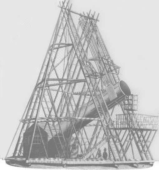 赫歇尔是比牛顿整整晚了一个世纪的人。他的一生当中共磨制了数百架望远镜,在研制反射式望远镜方面做出了重大贡献。他用自己磨制的一架口径15厘米的牛顿式望远镜发现了天王星。1786 年,他实施了一项令世人震惊的计划,制造了一架当时世界上最大的口径达1.2米的反射望远镜。镜筒长12 米,依靠一个15 米高的木构架竖立起来,就像一尊指向天空的巨型大炮,被人们称为赫歇尔的“大炮”(图2-4)。