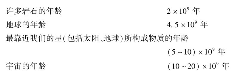 正如年是计算人生的适当单位,10 亿年是计算星球的寿命的适当单位。地球上最古老的岩石的年龄是26 亿年;太阳系必然是在45 亿年前形成的;天然放射性物质是50 亿年或100 亿年前从某种星体爆炸中形成的;而大部分星球的年龄似乎也在50亿年到100亿年之间。